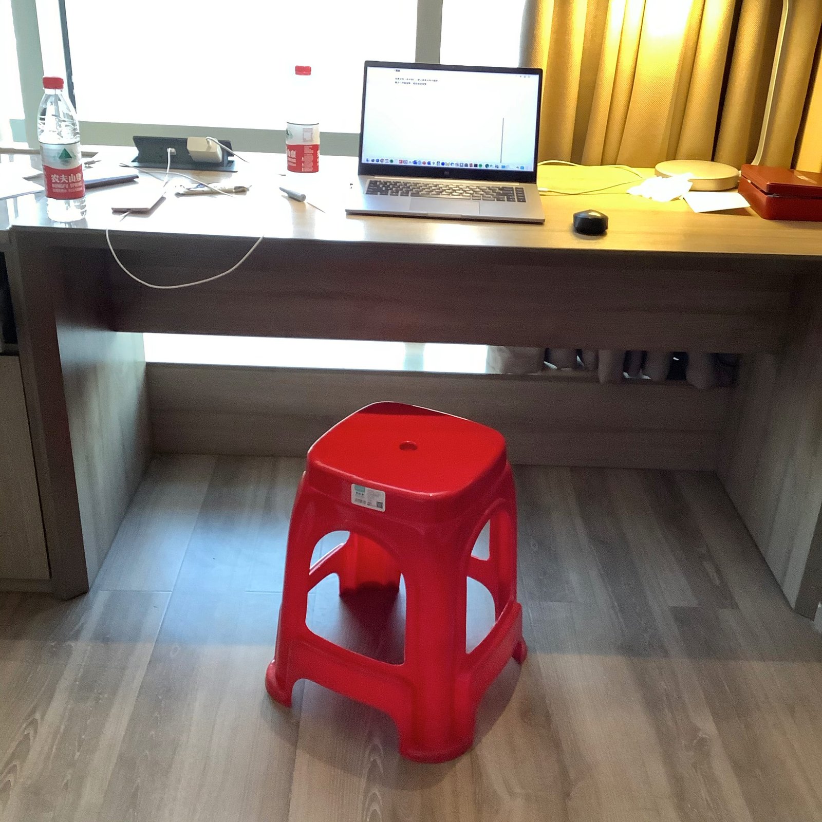 酒店也没有配矿泉水。我看网上的视频隔离酒店都会配一箱瓶装矿泉水,很多人也反应没有,看来有矿泉水都是在大家的期待之中的。我们也只能自己在网上买。然后奇怪的是,房间里面凳子或者椅子也没有,有一张大的办公桌,但是没有椅子也挺不方便的。门外会有一张凳子用来放工作人员派送的食物的,我们只能用这个凳子,坐久了腰酸背痛的。工作人员答应会解决这个问题,但是过了一个星期的样子才送过来一样的凳子…我期待的是一张有靠背的椅子啊… 罢了。